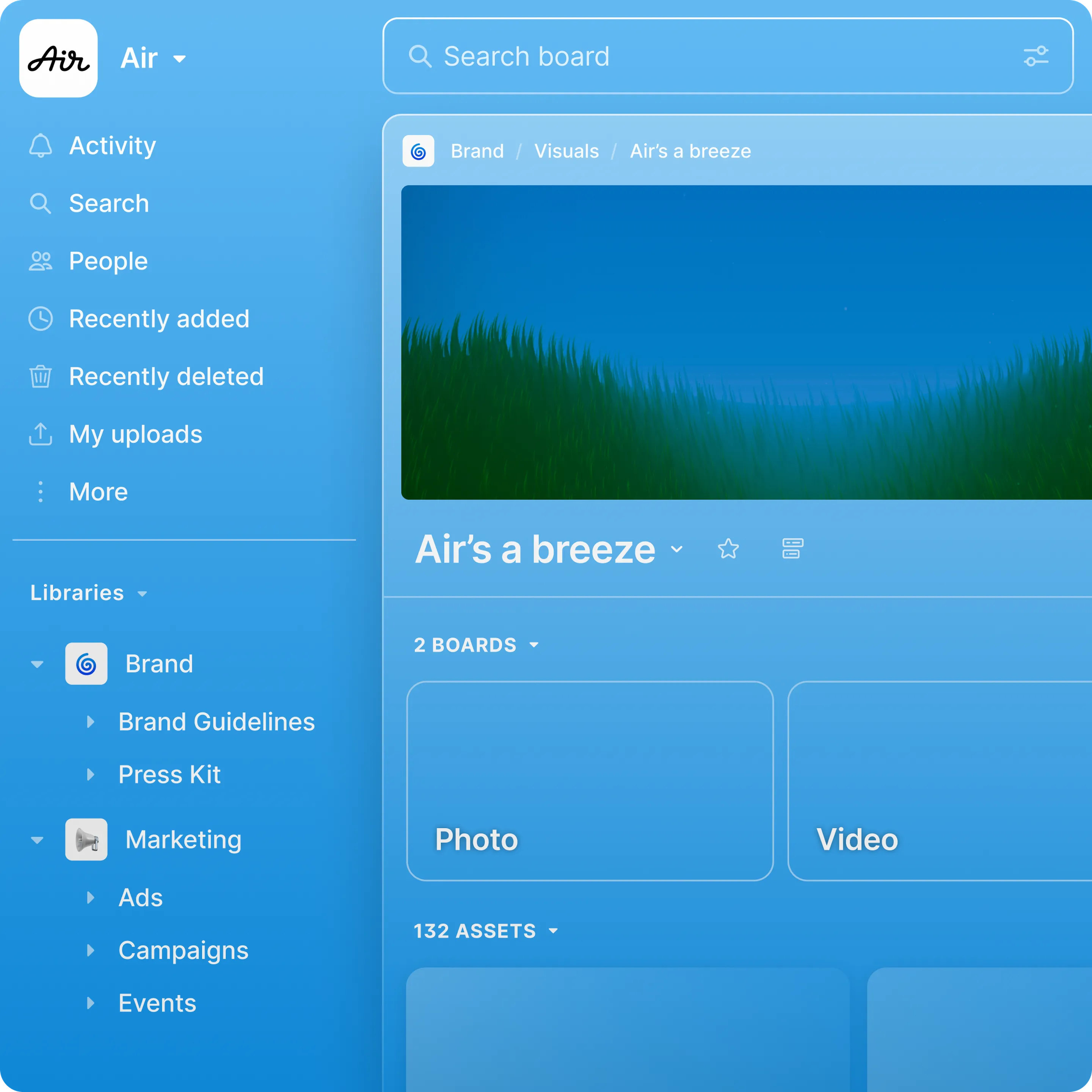 Brandfolder, founded in 2012, built their platform around traditional enterprise DAM needs and folder hierarchies that made sense a decade ago. Built from the ground up for modern creative workflows, Air's board-based structure and intelligent organization reflects how teams actually work today.