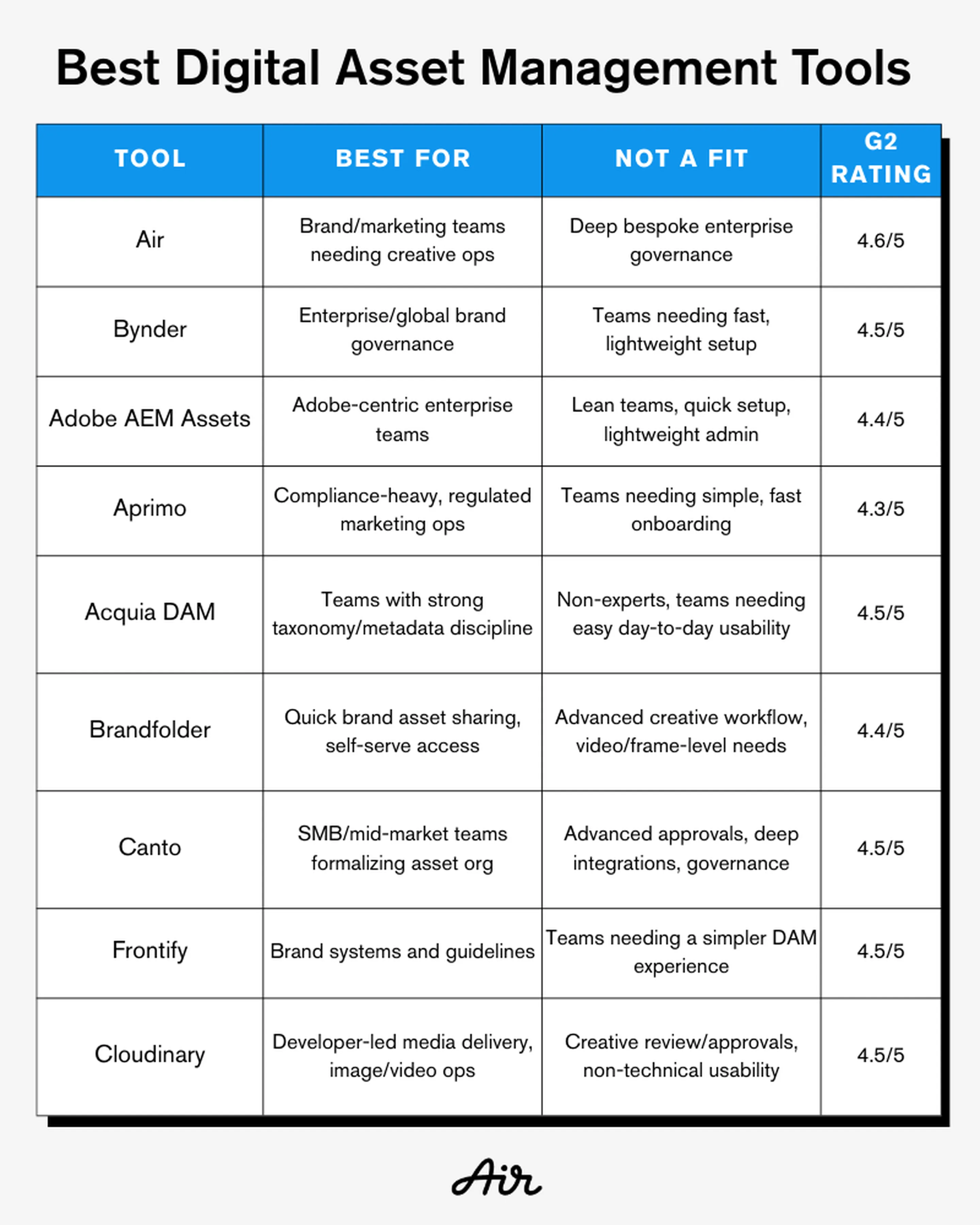 Brandfolder is ideal for marketing-led teams that need quick, reliable access to brand assets. It makes easy distribution to partners a priority. For a deeper dive comparison between Air and Brandfolder, check out our Brandfolder comparison guide.