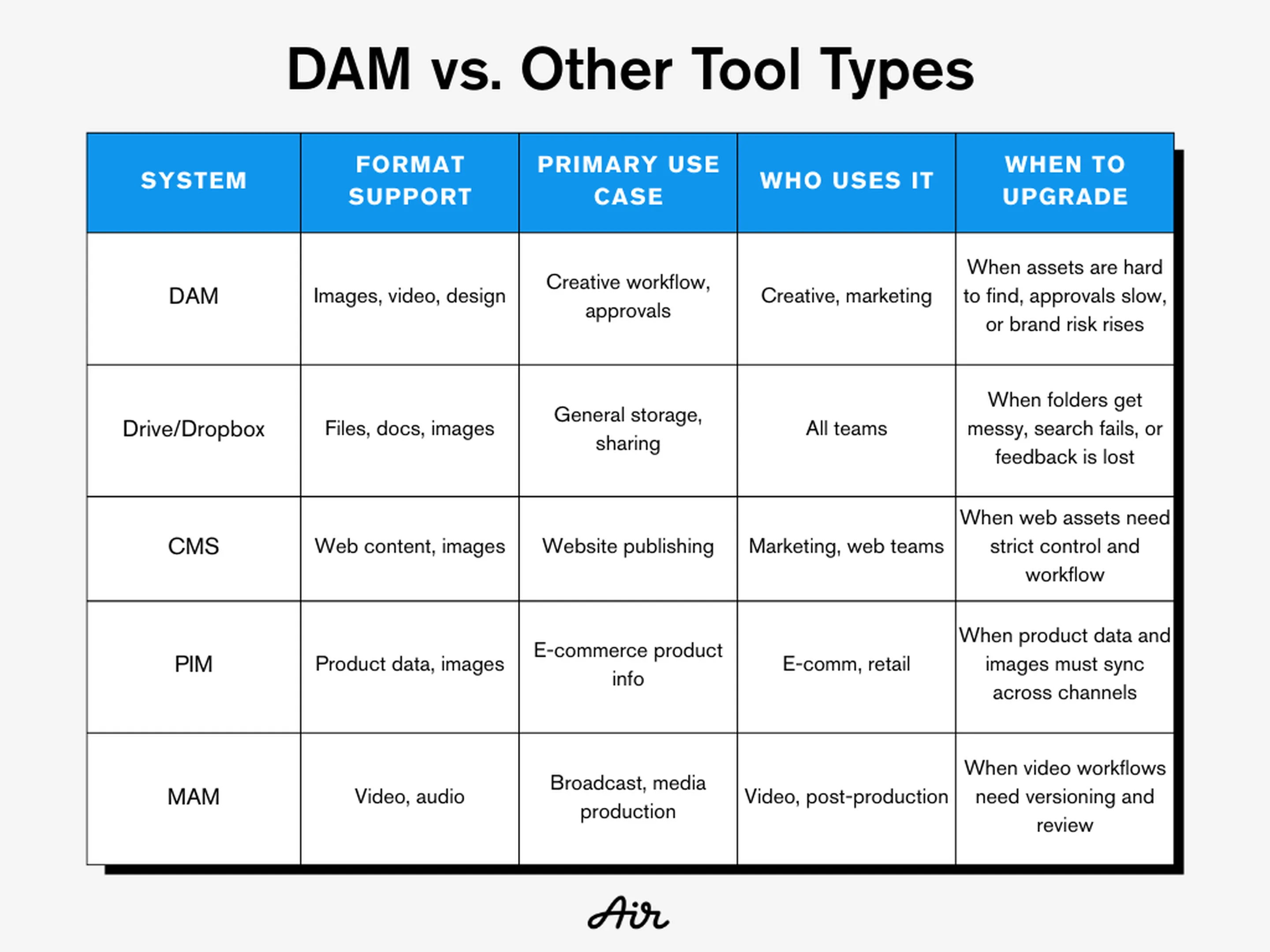 Upgrade when assets become hard to find, approvals slow down, or brand consistency suffers due to scattered files and lost feedback.